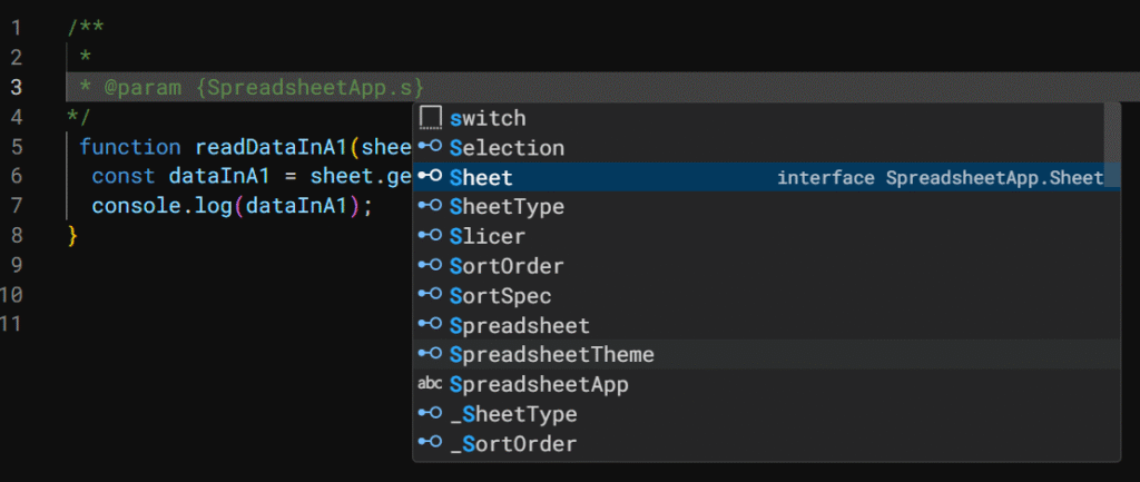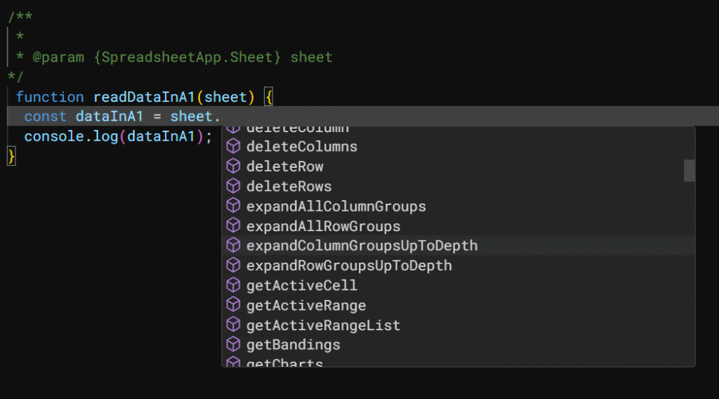 With this @param comment, Apps Script understands the type of sheet, and now when you type sheet. inside the function, autocompletion kicks in just like magic. No more second-guessing method names or switching tabs to check the docs.