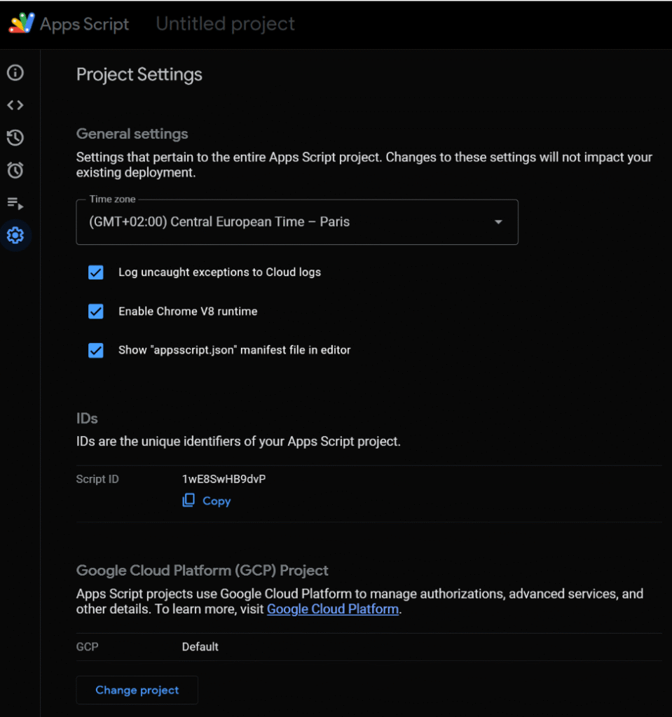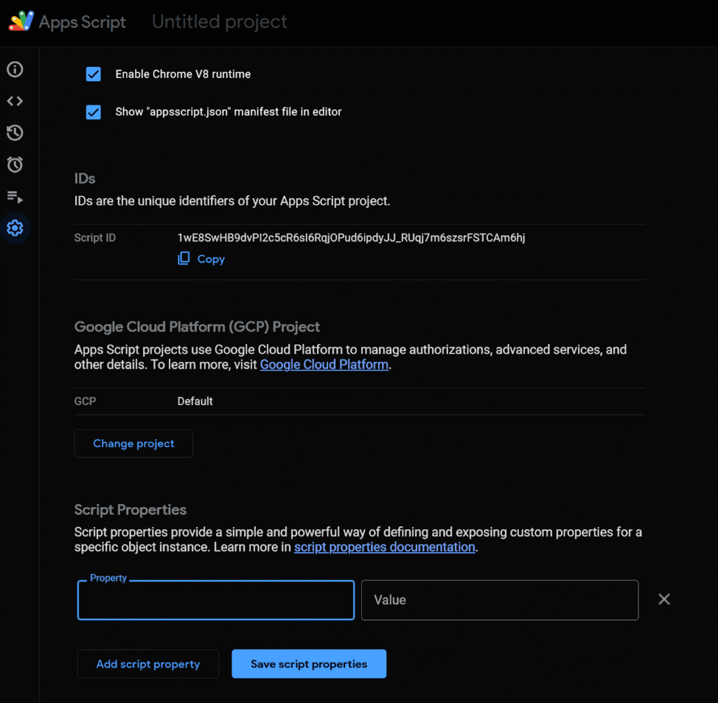 • IDs section – See your Script ID and your Google Cloud Project ID, both useful when linking APIs, deployments, or enabling advanced services.
