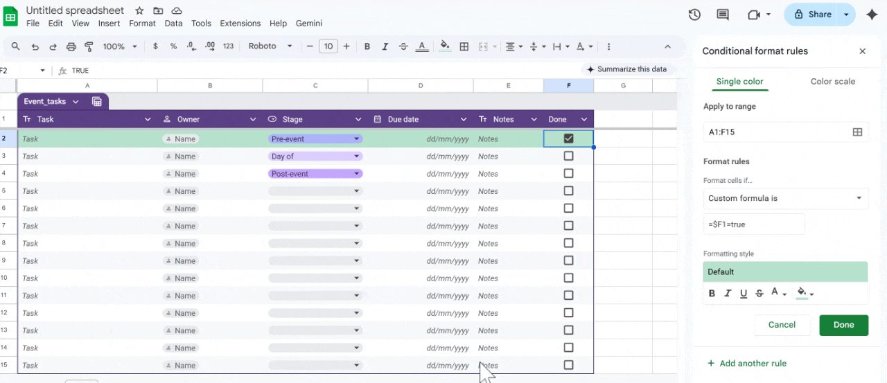 “I want the whole row to change color when the status is ‘Done’ / the date is today / the checkbox is ticked.”