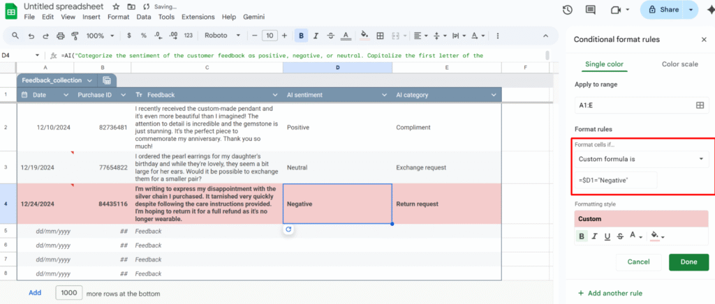 Because the prompt and the reference (like A2) live right in the formula, you can apply AI logic across a whole column just like any other function—without touching Apps Script or external tools.