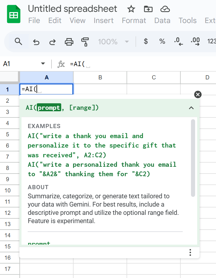 Google Sheets now has a native AI function (often exposed as =AI() or =GEMINI(), depending on your Workspace rollout) that lets you talk directly to Google’s Gemini model from a cell.