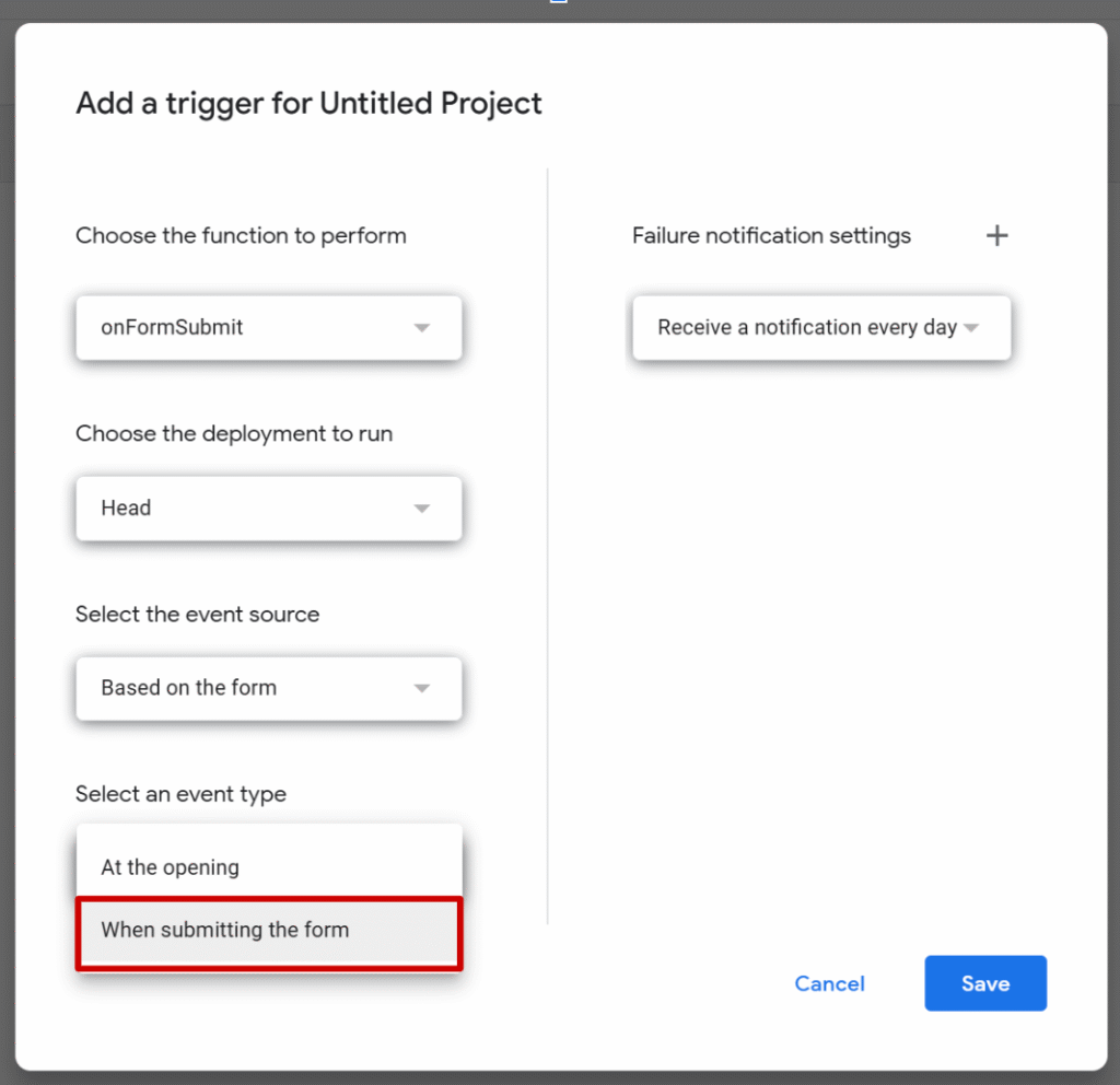 Select the function to launch, here onFormSubmit, and chose the event type “When submitting the form”, then save.