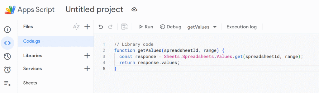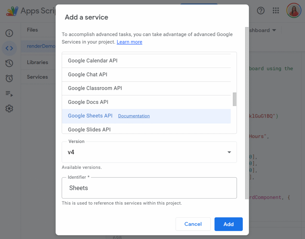 Before we can make the magic happen, we need to enable the Advanced Google Sheets API in our Apps Script project.