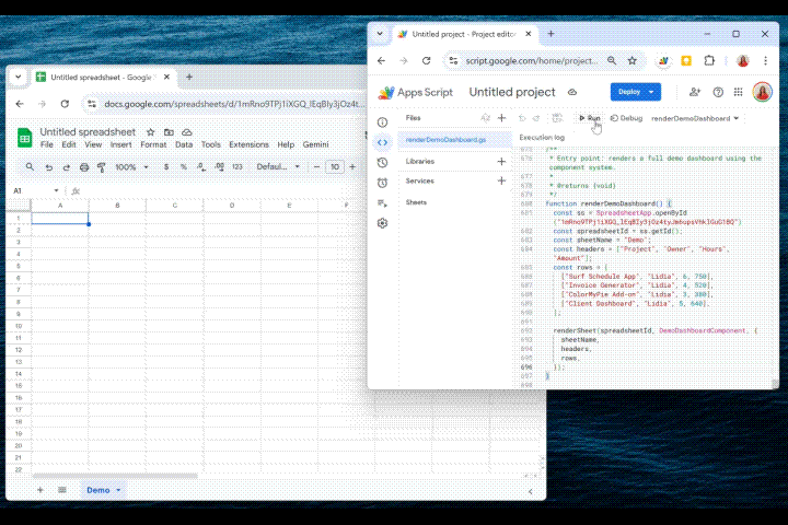 RenderSheet is a tiny, component-based renderer for Google Sheets, inspired by React’s architecture and built entirely in Apps Script.