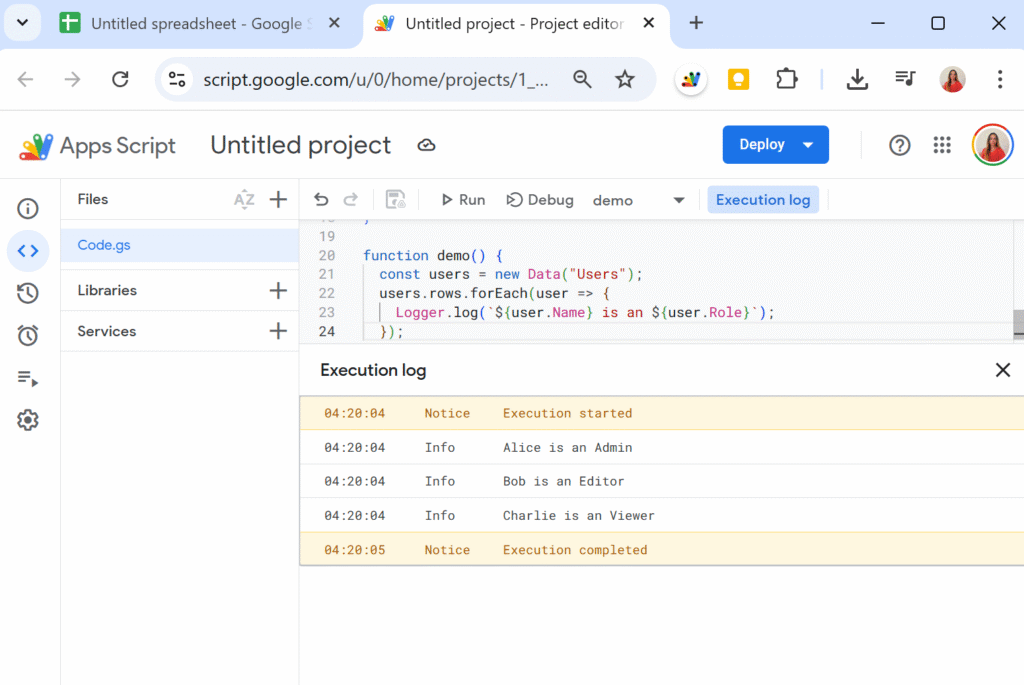 Sometimes you just want a quick pass/fail check in the Execution log without deploying a web app or integrating a full framework.