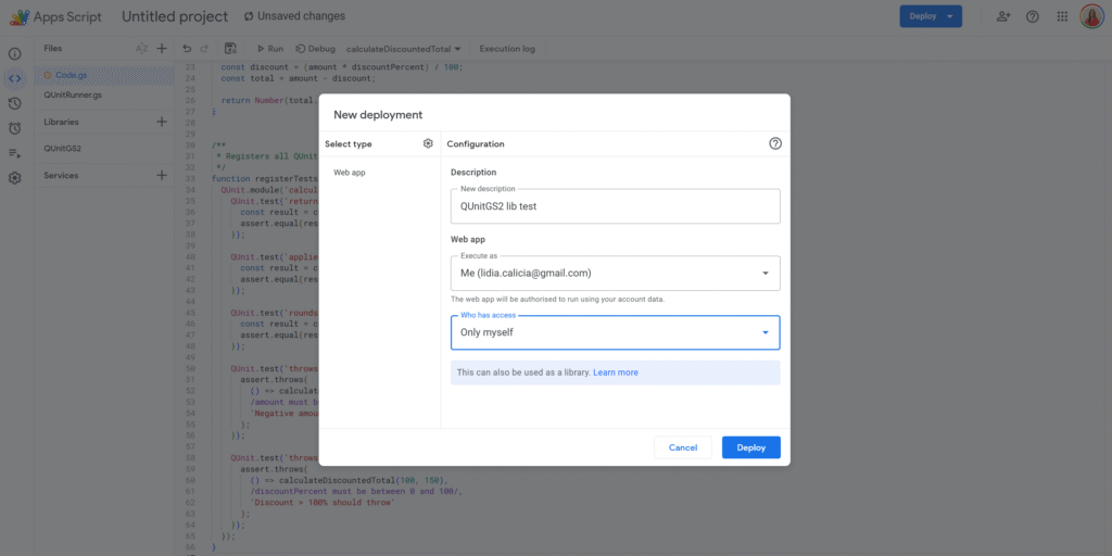 Using QUnitGS2 (QUnit2GS) in Google Apps Script
