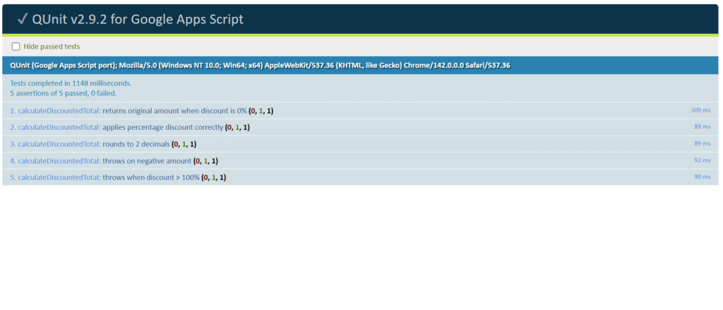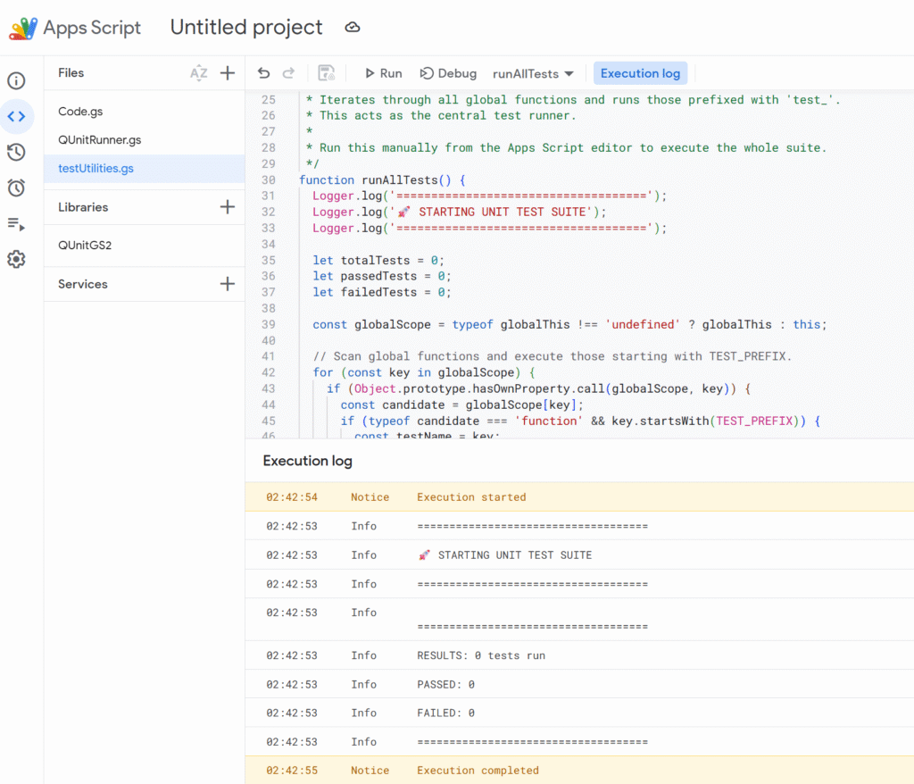 Let’s start with a more “formal” test suite using QUnitGS2, which adapts the popular QUnit framework to Apps Script.